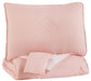 Bring a sophisticated look to your bedroom with this comforter set. Featuring a solid pink background with a stitched diamond design, the comforter reverses to a crisp and fresh arrow design in pink, white and gray—giving you the choice to change up your bedroom decor quickly and easily.