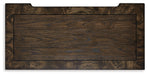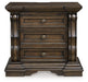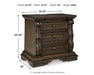 Details B947B11: Includes upholstered poster headboard panel, poster footboard panel, rails, slats, posts and canopy , Made with hardwood solids, oak veneer, MDF substrates and cast resin components, Dark brown finish, Metal canopy, Foam headboard cushion with polyester upholstery, Measure room, including ceiling height, to ensure bed clears fans and light fixtures, Foundation/box spring required, sold separately, Mattress available, sold separately, Assembly required, B947B1: Includes dresser and mirror, Made with hardwood solids, oak and ash swirl veneers, MDF substrates and cast resin components, Dark brown finish, 6 smooth-gliding drawers with dovetail construction (top drawer felt lined), Drawer pulls with antiqued goldtone finish, Mirror attaches to back of dresser, B947-46: Made with hardwood solids, oak and ash swirl veneers, MDF substrates and cast resin components, Dark brown finish, 5 smooth-gliding drawers with dovetail construction (top drawer felt lined), Drawer pulls with antiqued goldtone finish, B947-93: Made with hardwood solids, oak and ash swirl veneers, MDF substrates and cast resin components, Dark brown finish, 2 smooth-gliding drawers with dovetail construction (top drawer felt lined), Pull-out tray behind bottom drawer, Drawer pulls with antiqued goldtone finish, 110V power supply with dual USB charging ports, Power cord included; UL Listed,