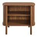 Revolutionize your bedroom or apartment decor with the Cadence Open Storage Nightstand. This modern nightstand is perfect at your bedside, offering both style and functionality. The unique design features rounded corners and fluted details, adding a stylish flair to any space. Crafted from high-quality materials such as rubberwood, particleboard, and MDF, the Cadence boho nightstand is designed for longevity and showcases a beautiful wood grain laminate, enhancing the organic aesthetics of your bedroom or living space. This open shelf nightstand has two storage compartments to comfortably support books, decorative items, or nighttime essentials. It includes non-marking foot glides for added stability. The Cadence fluted nightstand is a multi-functional piece that elegantly combines practicality with elegance and is versatile enough to serve as an open shelf side table, living room end table, or small accent table. Assembly required. Tabletop Weight Capacity: 79 lbs. Each Shelf Weight Capacity: 57 lbs.