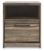 Details Made with engineered wood (MDF/particleboard/plywood) and decorative laminate for the right balance of affordability and durability, Weathered brown finish over replicated oak grain with authentic touch, Decorative laminate replicates natural or man-made material surfaces with consistent color, pattern and texture, Linear pull with antiqued gunmetal finish, Single smooth-gliding drawer and open cubby, Drawer interior is lined with a faux linen laminate for a clean, finished look, Slim-profile USB-A and USB-C charging ports, Power cord included; UL Listed, Minor assembly required