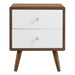 Harness the iconic energy of mid-century style in your master bedroom or guest room with the Transmit 2-Drawer Nightstand. Featuring two full-extension white lacquer drawers with chrome metal pulls, Transmit is crafted with solid wood and particleboard, smooth walnut grain laminate, and four wood tapered legs. Display a bedside table lamp, book, journal, or alarm clock on this contemporary nightstand while concealing bedside essentials in the spacious drawers. This nightstand also serves as a stylish accent side table in the living room. Assembly required.