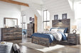 This full-size panel bed with storage, dresser, mirror, chest of drawers and nightstand is a refined take on barn board beauty. Its complex, replicated wood grain showcases hints of burnt orange and teal tones for a sense of weatherworn authenticity. Double drawers at the foot of the bed also come in mighty handy. The dresser, chest and nightstand with smooth-gliding drawers lined with faux linen laminate and industrial dark-tone hardware complete this rustic and industrial style bedroom. Mattress and foundation/box spring available, sold separately.