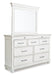Details B777B4: Includes queen upholstered headboard, panel footboard and rails, Made with solid wood, veneers and engineered wood, Distressed whitewash finish, Button tufted fabric upholstery, Nailhead trim, Foundation/box spring required, sold separately, Mattress available, sold separately, Assembly required, B777B1: Includes dresser and mirror, Made with solid wood, veneers and engineered wood, Distressed whitewash finish, Dark gray pewter-tone finished metal hardware, 7 smooth-gliding drawers, plus 2 small-scaled accessory drawers, Mirror attaches to back of dresser, Assembly required, B777-46: Made with solid wood, veneers and engineered wood, Distressed whitewash finish, Dark gray pewter-tone finished metal hardware, 7 smooth-gliding drawers, B777-93: Made with solid wood, veneers and engineered wood, Distressed whitewash finish, Dark gray pewter-tone finished metal hardware, 2 smooth-gliding drawers, plus 1 small-scale top accessory drawer,