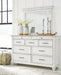 | Details | B777B1: Includes dresser and mirror, Made with solid wood, veneers and engineered wood, Distressed whitewash finish, Dark gray pewter-tone finished metal hardware, 7 smooth-gliding drawers, plus 2 small-scaled accessory drawers, Mirror attaches to back of dresser, Assembly required, B777B6: Includes queen panel headboard, storage bench footboard and rails, Made with solid wood, veneers and engineered wood, Distressed whitewash finish, Foundation/box spring required, sold separately, Mattress available, sold separately, Assembly required, | |