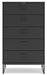| Details | Made with engineered wood (MDF/particleboard/plywood) and decorative laminate for the right balance of affordability and durability, Decorative laminate replicates natural or man-made material surfaces with consistent color, pattern and texture, Matte black finish with replicated wood grain, Dark pewter-tone pulls, Metal legs with pewter-tone finish, 5 smooth-gliding drawers with vinyl-wrapped sides and back for durability, Safety is a top priority, clothing storage units are designed to meet the most, current standard for stability, ASTM F 2057 (ASTM International), Drawers extend out to accommodate maximum access to drawer interior while, maintaining safety, Assembly required | |