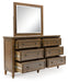 | Details | B787B5: Includes upholstered headboard, panel rails and bench footboard with slats, Made with hardwood solids, veneers and MDF substrates, Brown finish, Polyester upholstery, Nailhead trim, Turned feet, Foundation/box spring required, sold separately , Mattress available, sold separately, Assembly required, B787B1: Includes dresser and mirror, Made with hardwood solids, veneers and MDF substrates, Brown finish, Oil-rubbed bronze-tone knobs, 6 drawers with fully finished interior, dovetail construction and heavy duty ball-bearing side glides (top drawers felt lined), Turned feet, Mirror attaches to back of dresser, | |
