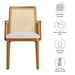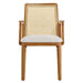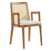 Elevate your dining space with the Monarch Dining Armchair, a stunning blend of French country elegance and modern farmhouse style. This wood dining room chair features a sturdy beech wood frame and a rattan backrest with intricate cane webbing, granting both style and durability. The dense foam padded seat, covered in soft fabric upholstery, provides lasting comfort, making it a comfortable fabric accent chair perfect for longer meals. Designed as a comfortable dining chair with armrests, Monarch offers versatile placement around a dining table, in a living room, or in an office space. Whether used as a rattan back dining chair with arms or as a cane accent chair, it enhances your dining experience with its refined aesthetic and protects floors with its non-marking floor glides. This farmhouse cane back dining armchair fits seamlessly into any d�cor, making it perfect for both formal dinners and casual family meals. The Monarch Farmhouse Dining Armchair combines traditional craftsmanship with contemporary style, making it a versatile wood dining accent chair with a cane back for your dining room. Weight Capacity: 330 lbs.