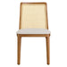 Elevate your dining space with the Monarch Dining Side Chair, a stunning blend of French country elegance and modern farmhouse. This wood dining room chair features a sturdy beech wood frame and a rattan backrest with intricate cane webbing, granting both style and durability. The dense foam padded seat, covered in soft fabric upholstery, provides lasting comfort, making it a comfortable fabric accent chair perfect for longer meals. Designed as an armless padded dining chair, Monarch offers versatile placement around a dining table or in a living room or office space. Whether used as a side dining chair with an upholstered seat and rattan back or as a cane accent chair, it enhances your dining experience with its refined aesthetic and protects floors with its non-marking floor glides. This armless side chair with a rattan back fits seamlessly into any d�cor, making it perfect for both formal dinners and casual family meals. The Monarch Farmhouse Dining Side Chair combines traditional craftsmanship with contemporary style, making it a versatile wood dining accent chair with a cane back for your dining room. Weight Capacity: 330 lbs.