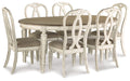 Details D743-35: Made of veneers, wood and engineered wood, Antiqued two-tone finish, Separate extension leaf, Table extends by pulling both ends and dropping in leaf, Seats up to 6, Assembly required, D743-02: Made with wood and engineered wood, Distressed, chipped white finish, Stylized ribbon back design, Polyester upholstery over foam cushioned seat, Assembly required,