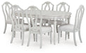 Details D795-35: Made with hardwood solids, acacia wood veneer, MDF substrate and cast resin components, Antiqued white finish, Tabletop with butterfly-matched veneer pattern, Removable center leaf, Table extends by pulling both ends and dropping in leaf, Seats up to 6, Dining chairs sold separately, Assembly required, D795-01: Made with solid wood frame and cast resin components, Antiqued white finish, Polyester upholstery, Foam cushioned seat, Includes adjustable levelers, Assembly required,