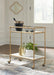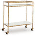 Details Made with sand casted aluminum, Antiqued brass-tone finish, White marble lower shelf, Clear glass top shelf, Casters for mobility, Color variations, fissures, mineral deposits and veining in the marble shelf are naturally formed characteristics, Assembly required