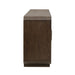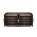 - Two double door cabinets each contain a drawer, adjustable shelf, and lower cutout to pass cords through