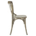 Introduce feelings of nostalgia as you gather around the dining table for a quick breakfast or dinner with friends with the Gear Dining Side Chair. Blending farmhouse charm with modern style, this dining chair features an X-brace back and stretchers between splayed legs. With non-marking foot caps to protect flooring, this side chair is durably crafted with durable elm wood for a sturdy construction built to last. Make a statement in your dining space or kitchen nook with this versatile wood dining chair that can also be used as an accent chair in a living room or desk chair in a home office. Weight Capacity: 330 lbs.