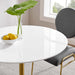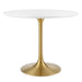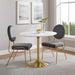 Let modern inspiration flow while gathered around the Lippa 36" Round Dining Table. Perfect for entertaining family and friends or everyday dining, this pedestal table comfortably seats two. Its round tabletop is crafted with MDF with a high gloss finish and beveled edge for a contemporary yet timeless design. Embodying an iconic mid-century silhouette, this pedestal dining table floats on a sleek tapered metal pedestal base with a chip-resistant brushed gold finish. Includes non-marking felt pad to protect flooring. Assembly required.