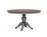 Effortlessly transition from small family meals to entertaining additional dining guests with the versatile Plymouth round dining table. This classic design easily fits in smaller dining areas to comfortably seat four and can expand to accommodate more by adding the included leaf. Featuring an intricately carved single pedestal base and a distressed graywash finish accented by a medium brown top, this table evokes a cottage-style charm that adds warmth and character to your home.