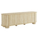 Bring a timeless blend of functional elegance and contemporary design tailored for your living space with the Overture TV Stand with 3 Doors. Supporting flat screen TVs up to 70 inches, the Overture Media Console enhances the beauty and functionality of any room with its curved profile design. Crafted from durable particle board and MDF, this oval TV stand radiates with the warm, inviting hues of travertine through a laminate finish. With its refined curved corners and sleek silhouette, this modern under tv table stretches 63 inches in length, offering substantial storage space while maintaining a stylish presence. The Overture TV Entertainment Center features three doors with push-to-open functionality for a smooth facade, promoting a clean and minimalist aesthetic. Inside the TV cabinet, three cable management holes and adjustable shelving provides versatile storage solutions, allowing you to customize the space�whether for media essentials, board games, or other storage needs. Elevated by four round legs and additional central supports, the Overture TV Console Cabinet provides stability and durability, making it an ideal media console cabinet for your living area. Assembly Required. Weight capacity of top shelf: 231.5 lbs. Adjustable Shelves: 22 lbs. Bottom Shelf: 44 lbs