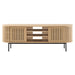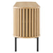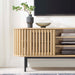 Embrace the clean lines and contemporary style of the Fortitude 71" TV Stand. Showcasing a captivating oval shape, this TV stand brings a modern aesthetic to any room. The open middle storage area accommodates media accessories and includes an open back for seamless cable management. Two adjustable center shelves allow for versatile storage options, while two front sliding timber strip style doors offer a unique and attractive look. Constructed from MDF and particleboard with a natural wood grain finish, Fortitude rests on straight round black metal legs for a sleek look. This high profile TV stand has a weight capacity of 200 lbs and supports flat screen TVs up to 78 inches, blending functionality and style to suit your entertainment needs. Includes non-marking foot caps. Assembly required.