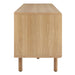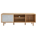 Bring urban flare to your living space with the modern design of the Kurtis 67" TV and Vinyl Record Display Stand. Featuring sliding metal mesh doors, this entertainment center brings industrial design to the living room, bedroom, home office, or lounge area. This media stand is crafted from MDF and particleboard with a natural wood grain design. Offering ample storage space for all your media essentials, this TV console features an open shelving area concealed by mesh sliding doors with cable management holes that keep things organized and allow for flow through ventilation. Display your vinyl record collection with the metal dividers on this versatile display stand. Resting on sturdy wood legs with non-marking foot pads to protect flooring, this low-profile TV stand accommodates flat screen TVs up to 65 inches. Assembly required. Weight Capacity: 200 lbs.