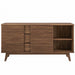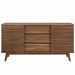 Tap into mid-century aesthetics with the Render Sideboard Buffet Display Stand. This dining room buffet table features a durable particleboard frame with smooth walnut grain laminate, four tapered wood legs, an adjustable shelf on both sides, three center full-extension glide drawers, and two sliding doors for easy access to shelf storage. Render features an abundance of storage for your silverware, dishes, and other dining room finery. Boasting a mid-century modern style this accent table features a solid construction with a pleasing look and practical functionality. Perfect as a sideboard, credenza, storing and serving buffet table, and display stand, Transmit also accommodates flat-screen TVs up to 70� wide as a living room or lounge area TV stand. Please Note: When placing the TV directly on the unit, we recommend anchoring it in place.