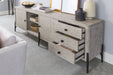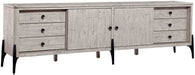 The contrast between the lightly textured parchment finish and matte black metal hardware provides a clean, contemporary look and timeless style. Cleverly scaled and full of functional features such as power outlets, USB ports and drop front drawers. Modular pieces can be configured to meet the unique needs of space and utility.