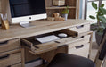 Offering a relaxed contemporary look from the complex organic finish to the contrasting metal accents and hardware. Functional features such as built-in AC & USB outlets, hidden compartments, locking file drawers, and drop front keyboard drawers make this an easy choice for your workspaces.