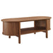 Revolutionize your home or apartment decor with the Cadence Coffee Table. This mid-century modern piece is perfect as a central table in your living room, offering both style and functionality. The unique design features curved edges and fluted details, adding a stylish flair to any space. Crafted from high-quality materials such as rubberwood, particleboard, and MDF, the Cadence coffee table is designed for longevity and showcases a beautiful wood grain laminate, enhancing the organic aesthetics of your living or lounge area. This oval coffee table is perfect for various uses, comfortably supporting books, decorative items, or beverages. It includes an open shelf underneath for displaying or organizing home decor, making it an excellent open storage coffee table as well as a modern accent table. Adjustable non-marking foot glides provide added stability. With an oval shape and chic silhouette, the Cadence fluted coffee table is a great living room essential that complements a variety of decors. Assembly required. Tabletop Weight Capacity: 169 lbs.
