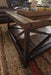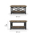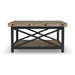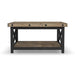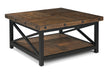 Industrial construction inspired by vintage workbench design. Drawing inspiration from vintage workbenches, the Carpenter square coffee table is constructed of solid wood planks, distressed for a reclaimed look, and hand-worked metal frames. Exposed bolt heads underscore the aged, oiled finish that resembles an industrial steel framework. This table is sure to be a conversation starter when it's your turn to host the next family get-together.
