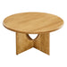The Rivian 34" Round Coffee Table combines mid-century modern elegance with innovative style. Its pedestal base, featuring arched cutouts in an intersecting design, creates a striking focal point in any room. Made from solid mango wood, this coffee table showcases a beautiful 34 inch round tabletop, perfect for complementing your living room furniture. Rivian is not just a statement piece but also a practical addition to your home. An ideal living room coffee table, this wood table also works well as a large center table for showcasing books, candles or plants, making it perfect for modern home essentials. Equipped with adjustable, non-marking foot caps, the Rivian round coffee table ensures floor protection and stability. Elevate any space with the Rivian versatile living room table. Some assembly required. Weight Capacity: 176 lbs.