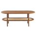 The Torus Coffee Table features a harmonious blend of modern and rustic aesthetics with its oval design and wood grain finish. Made of particleboard and MDF, the table features an upper panel and a bottom rattan shelf enclosed by a wood grain laminate rim. This unique interplay of materials creates a stunning visual appeal that enhances any space. The table's four round straight legs provide robust support, while non-marking foot caps protect your floors.