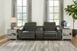 For those seeking to curate a living room retreat that offers superior comfort and a contemporary aesthetic, this sleekly designed power reclining loveseat with console will become your favorite source of at-home serenity. Rest on expertly matched leather and faux leather upholstery, and use the one-touch power control to recline and adjust the headrests with ease. As you recharge after a long day, your devices can too with USB charging. This loveseat is visually enticing in a luxe dark gray, with slope track arms and stitched detailing on the back to enhance its modern appeal.