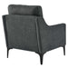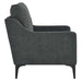 Create an atmosphere of balance and warmth in your living room, family room, entryway, or apartment with the relaxed sophistication of the Corland Upholstered Fabric Accent Armchair. The cultured profile of this mid-century modern chair beckons with the complementing curves of the armrests and the pillowy back cushion rising above the back frame, adding softness and stature. Amply padded with dense foam, the seat cushion of this living room armchair is nestled between sleek, sloped armrests flowing into black powder-coated metal legs with white non-marking foot pins. This accent chair is well-crafted on a sturdy plywood frame with a superior spring coil support system and tailored in soft, durable polyester fabric bringing high-performing design integrity into your home office or library. Corland is shipped in a convenient, easy-to-maneuver box with easy assembly instructions. Cushions are zippered and removable. Weight Capacity: 331 lbs.