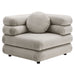 Reimagine your living space with the Jubilee Modular Sectional Sofa with Ottoman, a striking blend of retro flair and modern comfort. With its sleek design, the Jubilee 4-Piece Modular Sofa provides a spacious seating experience without compromising on style. This set includes one ottoman, two corner chairs, and one armless chair that connect with alligator clamp couch connectors, keeping them securely in place or allowing you to separate them as needed. Draped in stain-resistant performance velvet fabric, this comfy sofa exudes a luxurious feel with its dense foam padding and intricate detailing. The thick, gently tufted cushions are arranged in layers, creating a plush, stacked appearance with rounded edges for a cozy feel. The included three round pillows enhance both comfort and vintage charm, making this performance velvet upholstered modular sofa an inviting spot to relax. With premium zigzag spring pocket coils for robust support and comfort, Jubilee is the perfect oversized living room sofa or comfy sectional couch for hours of lounging. Equipped with plastic foot pads to protect your floors, this 4 piece modular sofa with ottoman is the retro fabric couch your modern decor needs. Assembly Required.