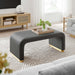 Let the Koda Performance Velvet Ottoman redefine your space with its style and adaptability. Crafted with a sturdy plywood frame, this large ottoman exudes a soft and flowing silhouette. Koda features stain-resistant performance velvet upholstery and a unique waterfall design. This multifunctional piece serves as both a chic ottoman and a fashionable coffee table, effortlessly blending classic design elements with a touch of contemporary allure. The dense foam padding ensures a comfortable experience, whether as extra seating, a footrest, or a stylish surface in your living room or lounge area. The Koda Upholstered Ottoman stands elegantly on a solid metal base with non-marking adjustable foot caps, ensuring stability while protecting your flooring. Assembly Required. Weight Capacity: 662 lbs.