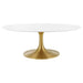 Let modern inspiration flow while gathered around the Lippa 42" Oval Coffee Table. Perfect for hosting a morning cup of coffee or entertaining family and friends, this pedestal table features a spacious surface. Its oval tabletop is crafted with durable MDF with a high gloss finish and beveled edge for a contemporary yet timeless design. Embodying an iconic mid-century silhouette, this pedestal coffee table floats on a sleek metal pedestal base with a chip-resistant brushed gold finish. Includes non-marking felt pad to protect flooring. Assembly required.