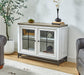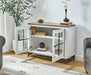 - The back panel contains an escape hole to the cabinet that allows cords to be ran through