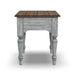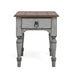 Simply charming with its graywashed weathered finish and contrasting medium brown top, the Plymouth end table adds both function and style to living spaces. Display décor on its planked top and keep eyeglasses or remotes neatly hidden away in the drawer. Antique gunmetal hardware and turned spindle legs complete the cottage-inspired look. Scaled to fit in tight spaces, this end table makes the ideal accent piece for smaller rooms.