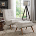 Glide your way forward. The Ramp lounge chair and ottoman set were designed to serve as a carefree and comfort-filled way to spend your leisure time. Sip your beverage of choice and kick back for some quality quiet time. Ramp is made with dense foam padding, comes finely upholstered in fabric with tufted buttons, and cherry stained wood legs. The Ramp lounge chair and ottoman series is perfect for modern living rooms and lounge spaces.