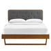 Infuse modern style into your master bedroom or guest room decor with the retro detail and organic aesthetics of the Bridgette Tufted Wood Queen Platform Bed. Inspired by mid-century style, the upholstered headboard on this queen bed frame features a classic button tufted design framed in rich wood grain. This platform bed frame is a sturdy addition to the bedroom with a durable wood, MDF, and veneer construction and an angular rubberwood frame. Eliminating the need for a box spring, this queen bed is complete with a wood slat support system, reinforced center beam, and supporting legs that make it a lasting mattress foundation for memory foam, latex, innerspring, and hybrid mattresses. Assembly required. Queen Bed Frame Weight Capacity: 601 lbs.