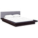 Instantly transform your bedroom landscape with the Freja Platform Bed. Designed with clean straight lines and a compelling aesthetic, Freja features a sturdy laminated particleboard base with cappuccino veneer, foam-padded headboard upholstered in polyester fabric, slatted support that eliminates the need for a box spring, and a reinforced center beam with supporting legs for maximal stability. Update your bedroom d�cor with an engaging platform bed which evinces a refined look and striking design. Freja admirably supports mattress types such as memory foam, spring, latex, and hybrid. Mattress Not Included.