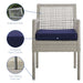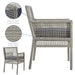 Weave conversational threads into a rollicking good time with Aura Outdoor Patio Dining Arm Chair. Aura is an outdoor dining chair that comes with a synthetic gray-on-gray tone wicker rattan weave and a powder-coated aluminum frame that delivers a softly versatile outdoor collection that shifts to meet the needs of the moment. Outfitted with a machine washable and fade resistant all-weather fabric cushion, Aura Patio Dining Chair will make your outdoor spot the focal point of good memories and festive gatherings while enhancing your patio, backyard or poolside arena. Complete with non-marking foot caps, enjoy spacious seating and enhanced comfort with this reliable piece of outdoor furniture.