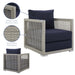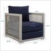 Weave conversational threads into a rollicking good time with Aura Outdoor Patio Armchair. Aura comes with a synthetic gray-on-gray tone wicker rattan weave and a powder-coated aluminum frame that delivers a softly versatile outdoor collection that shifts to meet the needs of the moment. Outfitted with machine washable and fade resistant all-weather fabric cushions, and designed with an extra wide and deep body, Aura will make your outdoor spot the focal point of good memories and festive gatherings while enhancing your patio, backyard or poolside arena. Featuring thick cushions and chrome plated anti-skid feet, enjoy spacious seating and enhanced comfort with this reliable piece of outdoor furniture. Comes fully assembled.