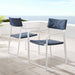 Introduce a sleek minimalist look to your outdoor furniture decor with the Raleigh Outdoor Patio Dining Armchair Set of 2. Raleigh's foam padded seat and back come upholstered with all-weather UV resistant fabric, while a sturdy powder-coated aluminum frame creates a durable frame that is stackable for easy, compact storage. Arrange the Raleigh Patio Armchair Set to suit your needs and support each gathering of friends and family. A versatile addition to your outdoor dining needs, the Raleigh Patio Chairs will enhance your patio, porch, deck, or poolside seating experience. Chair Weight Capacity: 300 lbs.