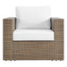 Featured-0 Outdoor Patio Armchair Synthetic Rattan Weave Powder-Coated Aluminum Frame Water and UV Resistant All-Weather Cushions Non-Marking Foot Glides Assembly Required