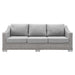Enjoy fresh air and alfresco relaxation with the Conway Outdoor Patio Wicker Rattan Sofa. Wrapped in UV-resistant light gray synthetic wicker rattan, this patio sofa boasts organic texture and a neutral hue that brings a calming presence to your outdoor space. The frame of this outdoor three-seater sofa is crafted with durable powder-coated aluminum and rests on L-shaped legs with plastic foot glides. Thick foam padded cushions covered with washable water-resistant Sunbrella� fabric covers offer a comfortable seat and affix securely to the outdoor couch with cord tension attachments. Trending aesthetics and a classic design define this outdoor patio furniture collection making it a beautiful addition to any outdoor space including the backyard, patio, porch, balcony, or poolside. Assembly required. Patio Sofa Weight Capacity: 900 lbs.
