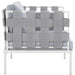 Engage life with Harmony Outdoor Patio Accent Arm Chair. Enjoy casual conversation under the open sky with an all-weather waterproof outdoor arm chair from a versatile furniture set that delivers an exceptional outdoor porch, patio, balcony or garden experience. An exceptional modern outdoor furniture set that exceeds expectations, Harmony Patio Accent Chair comes with silk polyester seat back weave, square powder coated aluminum bases, and non-marking foot caps. An outside deck chair that arranges according to the spontaneous needs of your guests, set your sights on open and inspired moments with the Harmony Outdoor Patio Collection.