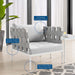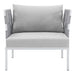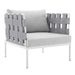 Engage life with Harmony Outdoor Patio Armchair. Enjoy casual conversation under the open sky with an all-weather waterproof outdoor chair from a versatile furniture set that delivers an exceptional outdoor porch, patio, balcony or garden experience. An exceptional modern outdoor furniture set that exceeds expectations, Harmony Patio Armchair comes with silk polyester seat back weave, square powder coated aluminum bases, Sunbrella� cushions, and non-marking foot caps. An outside sofa that arranges according to the spontaneous needs of your guests, set your sights on open and inspired moments with the Harmony Outdoor Patio Collection.