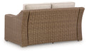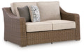 Who says the great outdoors isn’t made for luxury living? This outdoor loveseat offers all of the high-end design, plush comfort and durability you could ask for, and then some. Its all-weather aluminum frame and resin wicker provide the easy-breezy look you love without the high maintenance. And rest assured—the high-performing Nuvella® fabric is made to stand up to the elements.