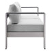 Enjoy your patio or backyard leisure time with the strong and durable Shore Outdoor Aluminum Lovesesat. Made with an anodized brushed aluminum frame and non-marking black plastic foot caps, Shore comes outfitted with resilient Sunbrella� fabric canvas cushions tested to last through all weather conditions. The Shore Outdoor Aluminum Loveseat complements your casual gatherings with a look and functionality you can rely on.