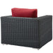 Experience the outdoors with exceptional comfort and quality. Summon Outdoor Patio Arm Chair offers an exquisite two-tone synthetic rattan weave, plush all-weather cushions with industry-leading Sunbrella� fabric, UV protection, and a sturdy powder-coated aluminum frame. Featuring an elegant modern look, Summon Patio Arm Chair is part of an avant-garde outdoor sectional series well-equipped for enhancing patio, backyard, or poolside gatherings. This installment of the series is an Outdoor Patio Arm Chair.