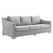 Enjoy fresh air and alfresco relaxation with the Conway Outdoor Patio Sunbrella� Wicker Rattan 4-Piece Furniture Set. Wrapped in UV-resistant light gray synthetic wicker rattan, this patio furniture set boasts organic texture and a neutral hue that brings a calming presence to your outdoor space. The frame of this outdoor furniture set and outdoor ottoman are crafted with durable powder-coated aluminum and rest on L-shaped legs with plastic foot glides. Thick foam padded cushions covered with washable water-resistant Sunbrella� covers offer a comfortable seat and affix securely to the lounge chair with cord tension attachments. Trending aesthetics and a classic design define this outdoor patio furniture collection making it a beautiful addition to any outdoor space including the backyard, patio, porch, balcony, or poolside. Assembly required. Set Includes: Sofa, Loveseat, Armchair, Coffee Table